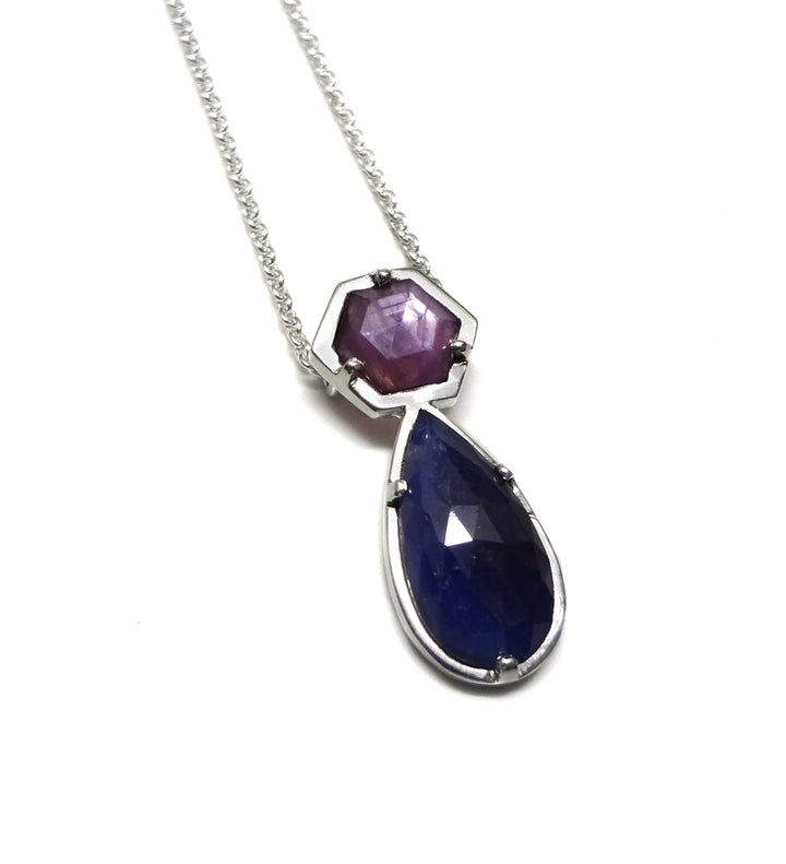 Collar en Plata 925 con dije de 3cm aprox. de Zafiro y Rubí. Largo de cadena de 39-45cm con aumento.