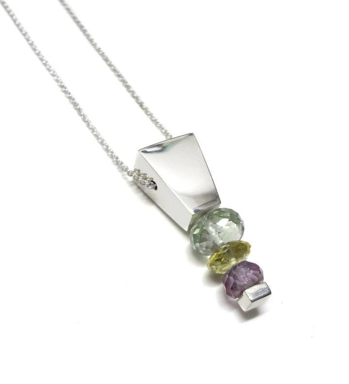 Collar en plata .925 con dije de 4.2cm de largo con cuarzo verde, cuarzo limón y amatista. Largo de cadena de 40-45 con aumento.